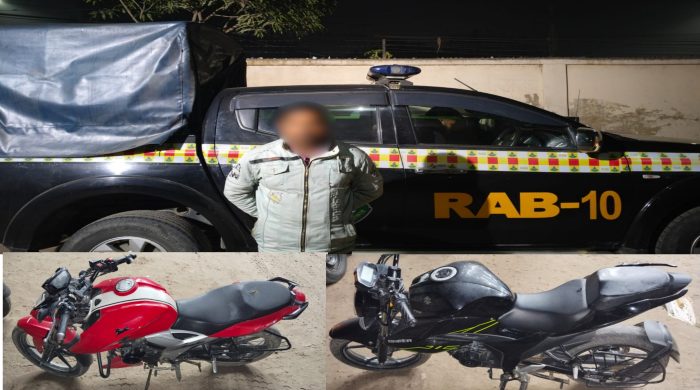 স্টাফ রিপোর্টার :রাজবাড়ীর পাংশা উপজেলায় পৃথক অভিযানে চোরাই মোটরসাইকেলসহ দুইজনকে গ্রেফতার করেছে র্যাব-১০। এ সময় পরিত্যক্ত অবস্থায় আরও একটি চোরাই মোটরসাইকেল উদ্ধার করা হয়। মঙ্গলবার (৬ জানুয়ারি) রাতে রাজবাড়ী জেলার